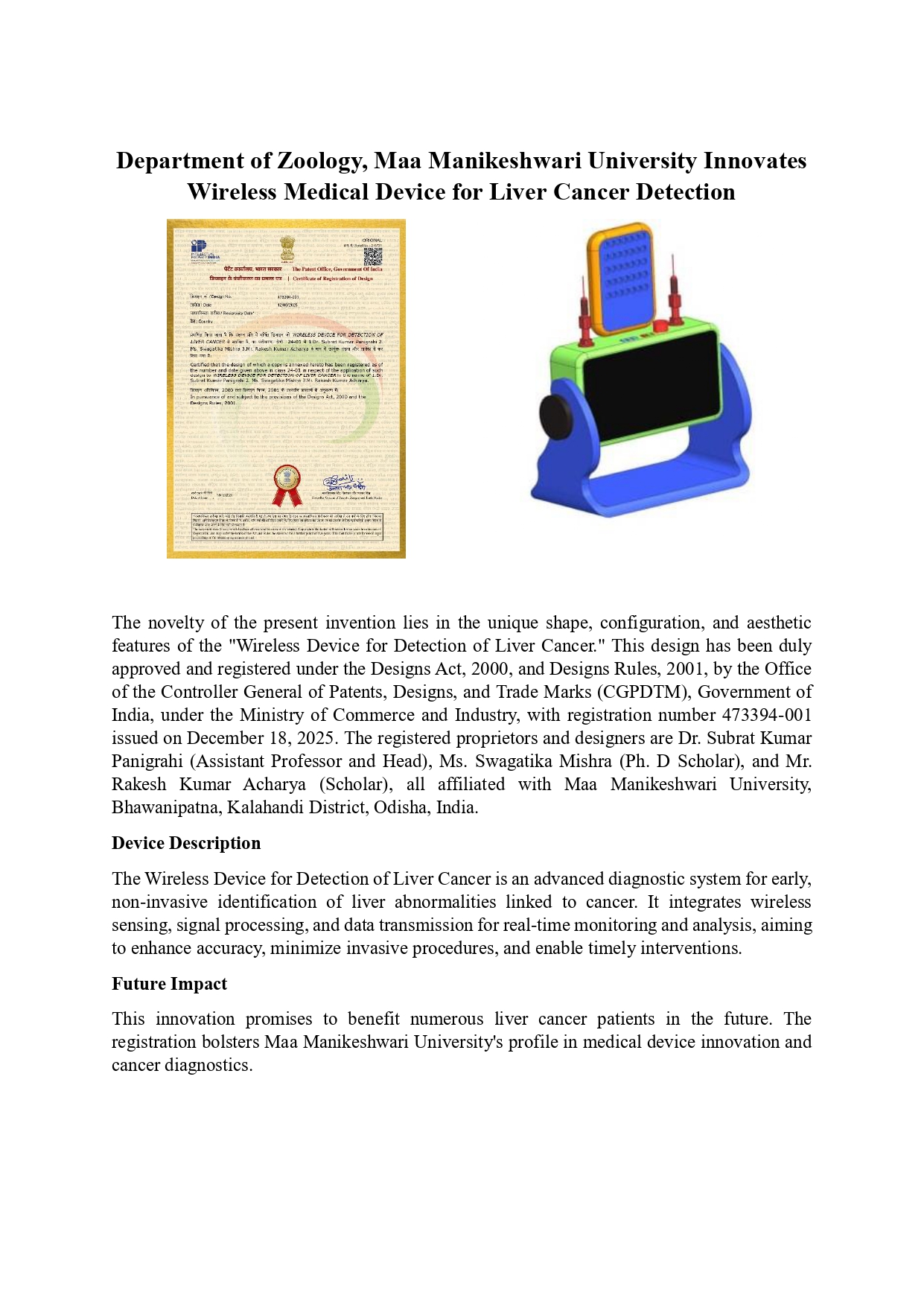 Topic: Department of Zoology, Maa Manikeshwari University Innovates Wireless Medical Device for Liver Cancer Detection